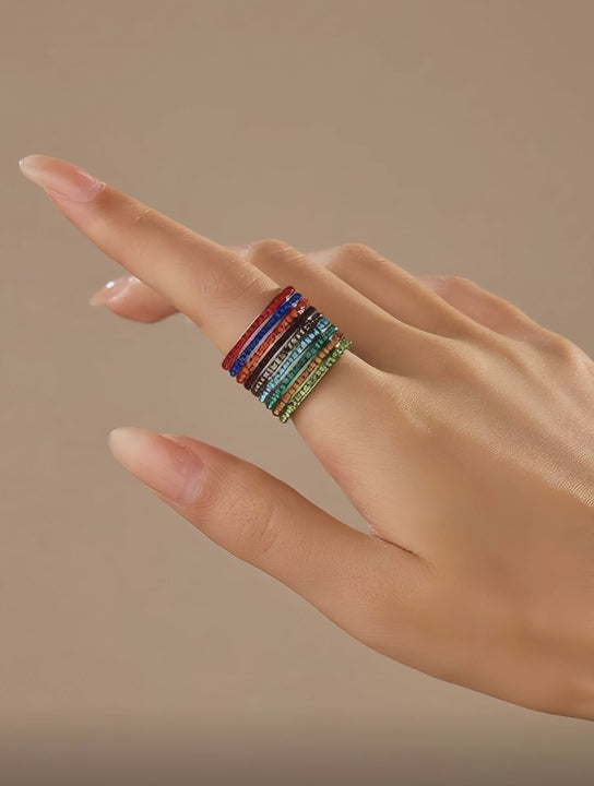 Each ring features its own vibrant row of stones, allowing you to mix, match, stack, or wear them solo depending on your mood.